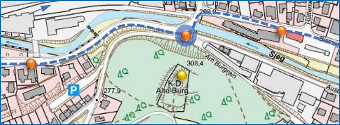 Von der Siegbrücke aus führt der Weg zur Burg über die steil ansteigende Burgstraße