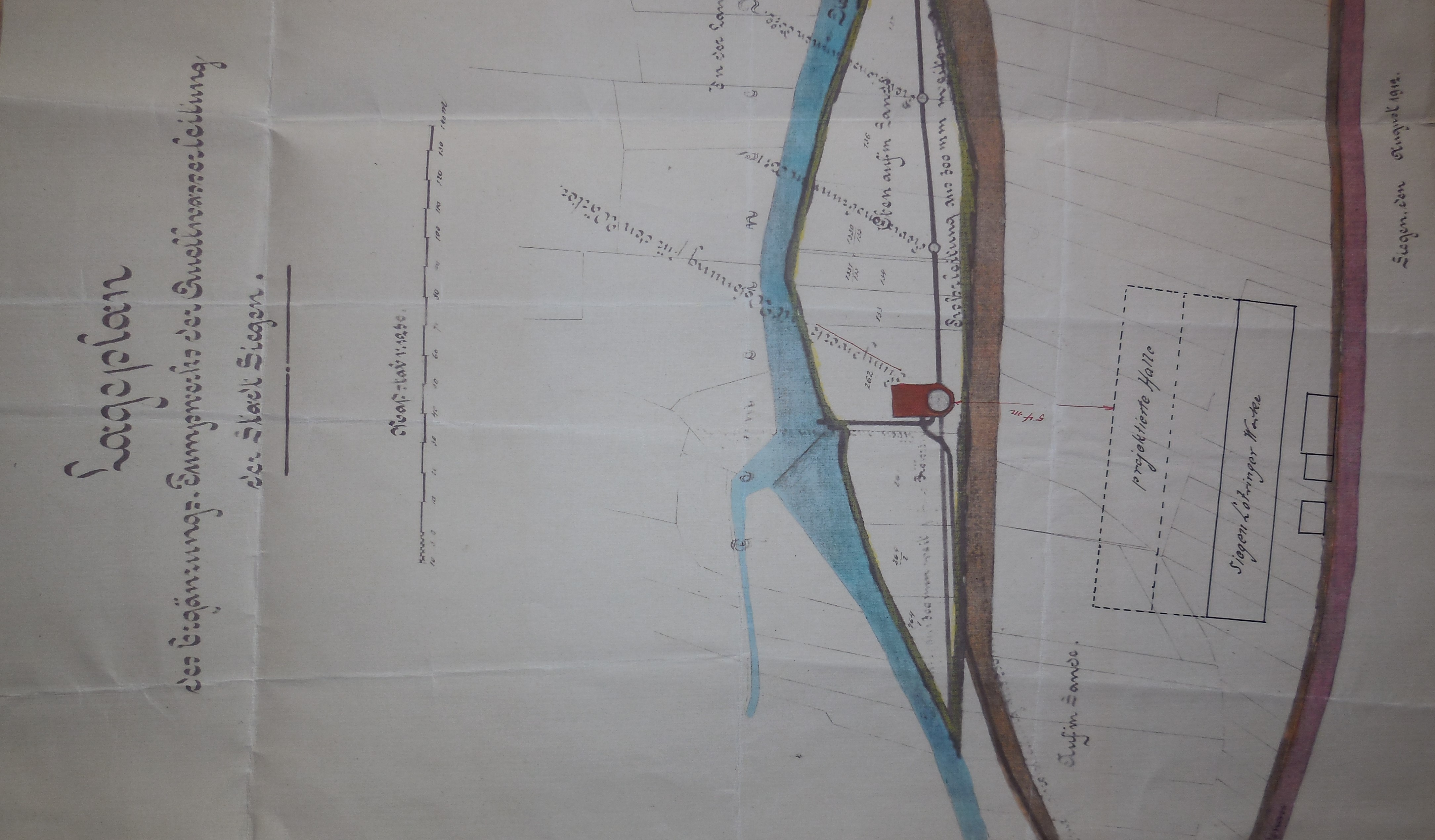 Die Stadt Siegen hatte ähnliche Probleme mit der Trink­wasser­versorg­ung der um 1900 stark wachsenden Bevölker­ung und der eben­falls expand­ierenden Indu­strie wie die Gemeinde Weidenau. Diese hatte sich den Alex­ander­brunnen in der Dreis-Tiefenbacher Sieg­aue erschlossen. Ganz in der Nähe, auf dem anderen Sieg­ufer, baute Siegen ein Wasser­werk. Das war 1913, zur sel­ben Zeit, in der auch die Siegen-Lothringen Werke, die spä­teren Kölsch-Fölzer-Werke, entstanden, genau gegen­über dem Wasser­werk Siegen.