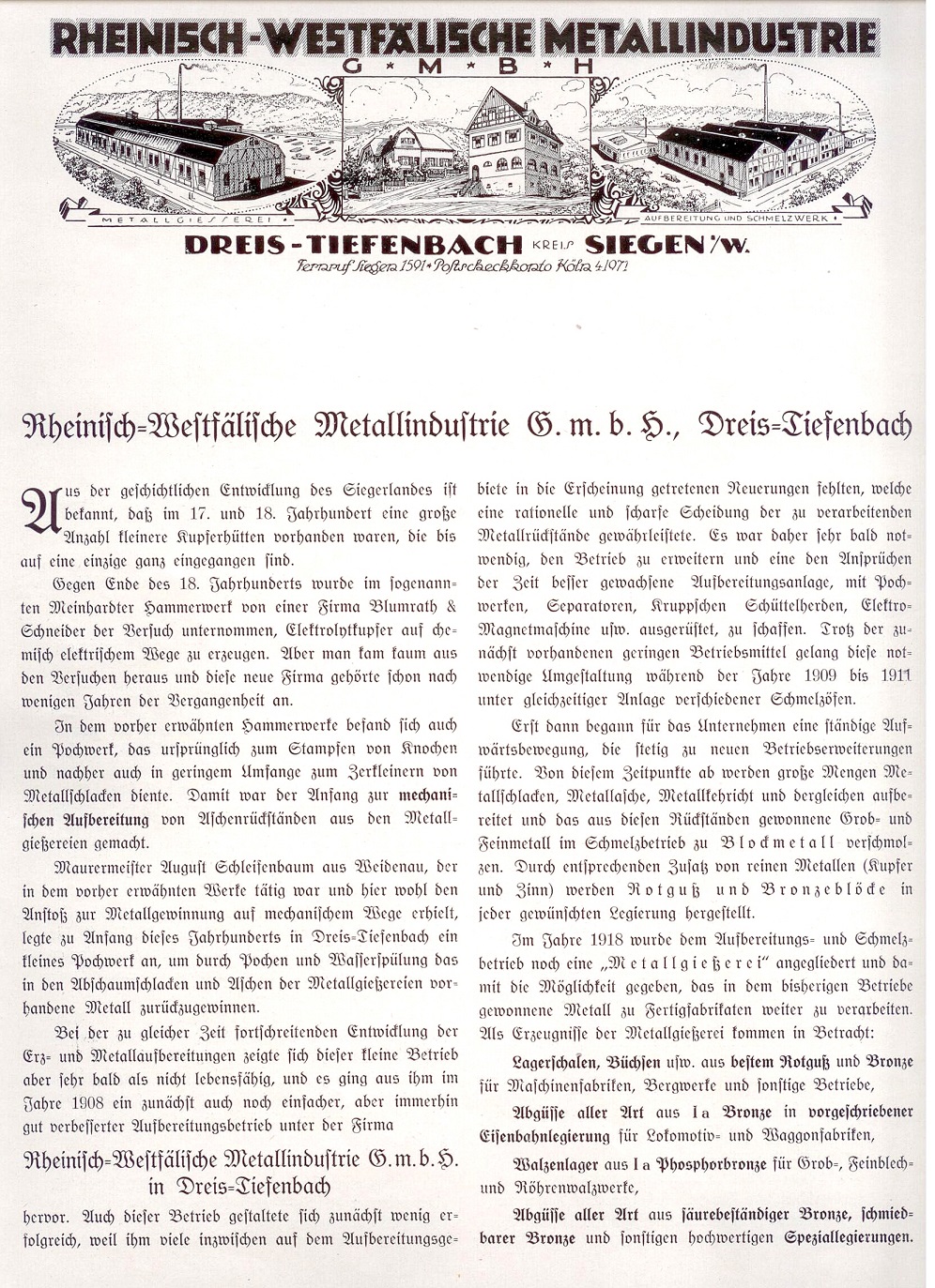 1918 errichtete die Rheinisch-Westfälische Metallindustrie (RWM) auf dem Gelände nahe der ehemaligen Blashütte eine Metallgießerei.